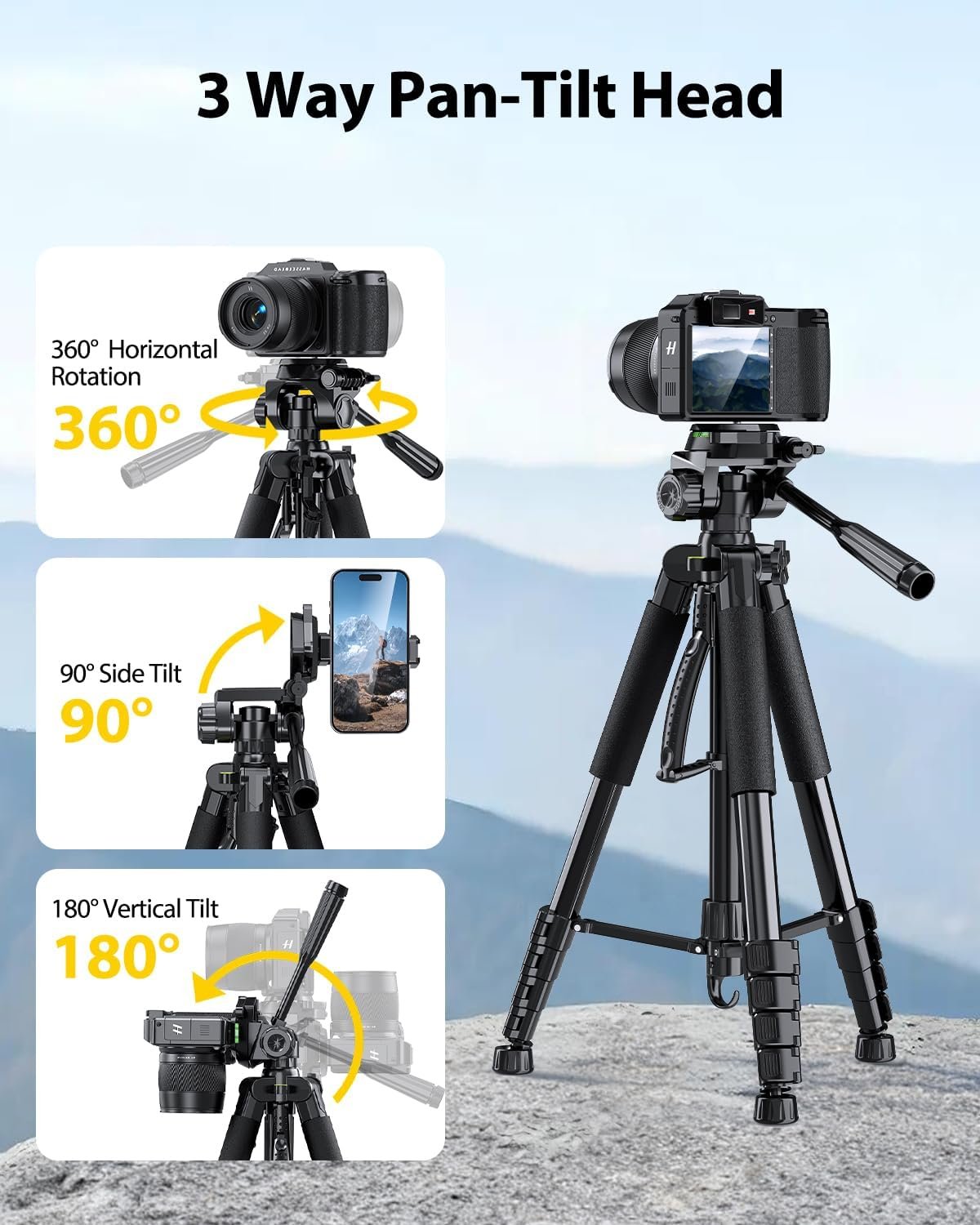 - Wide Height Range: Adjusts from just over 20 inches up to a maximum of 67 inches, perfect for everything from low-angle macro shots to eye-level portraits with a 67 inch tripod.